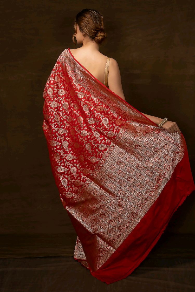 Red Pure Silk Woven Floral Banarasi Saree With Running Blouse